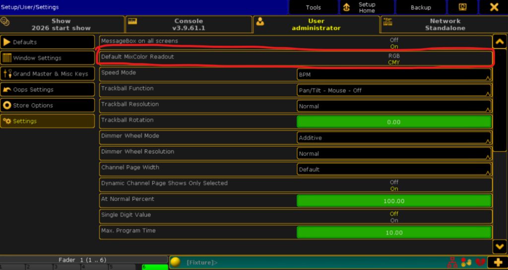 Setup➡Setting➡Default MixColor Readout➡設定をRGBかCMYに変えれます